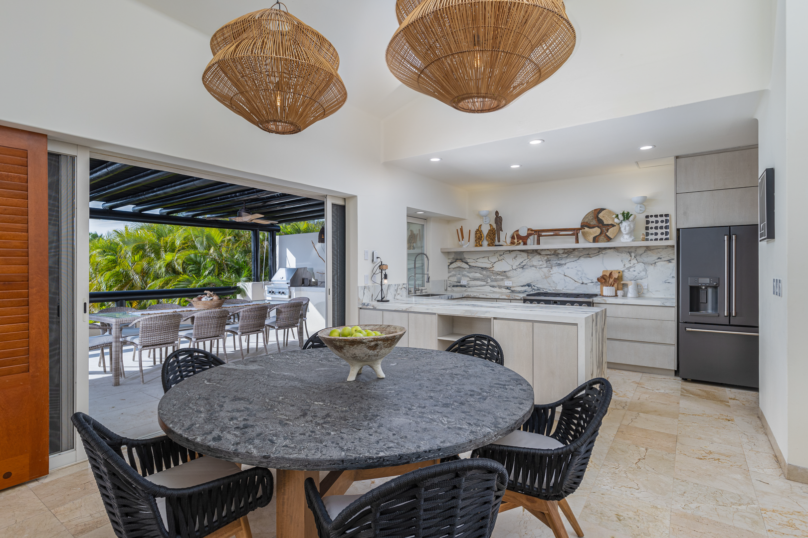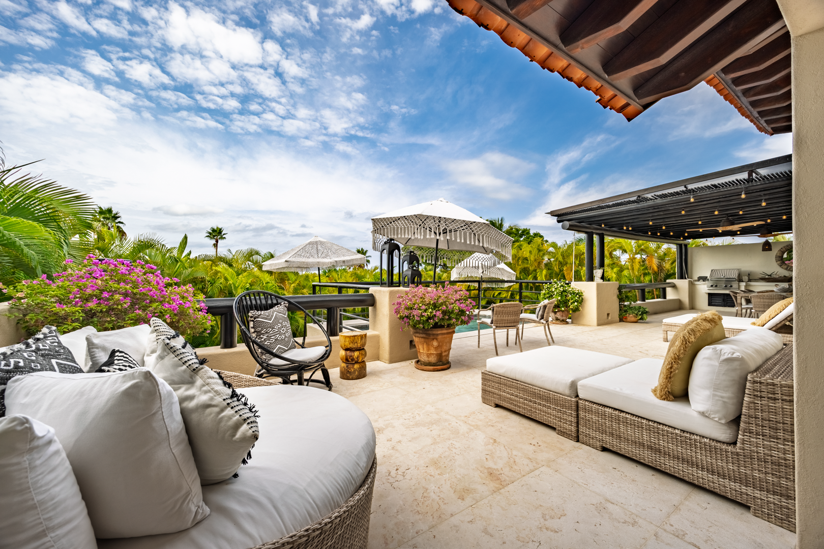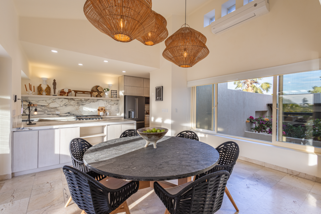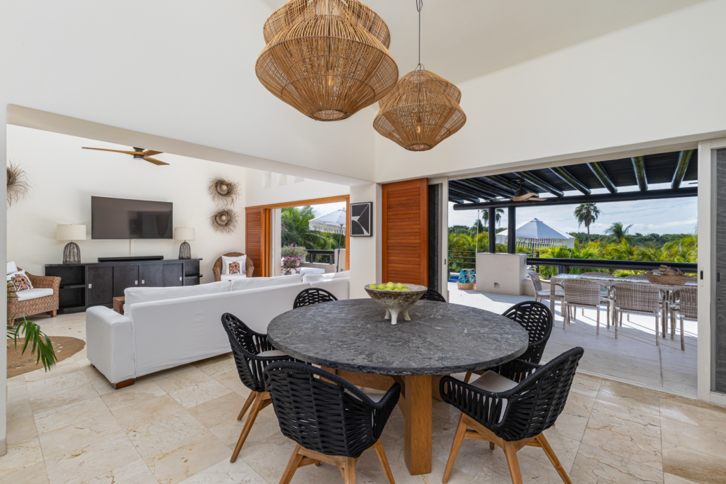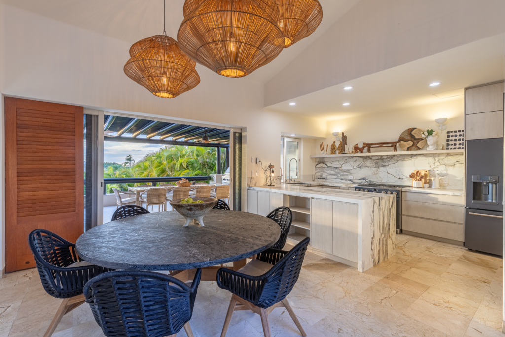 From the moment you walk through the doors of Casa Libre, you’ll be transported to paradise. The living area seems to be floating, looking out to an incredible view of blue sky, the sparkle of water from the pool, palm trees, and slivers of the ocean. The outdoor space off the living area is truly special, with covered outdoor dining for 12, perfect for family meals or entertaining. It also includes a gas grill and granite serving area with a pass-through window to the kitchen.