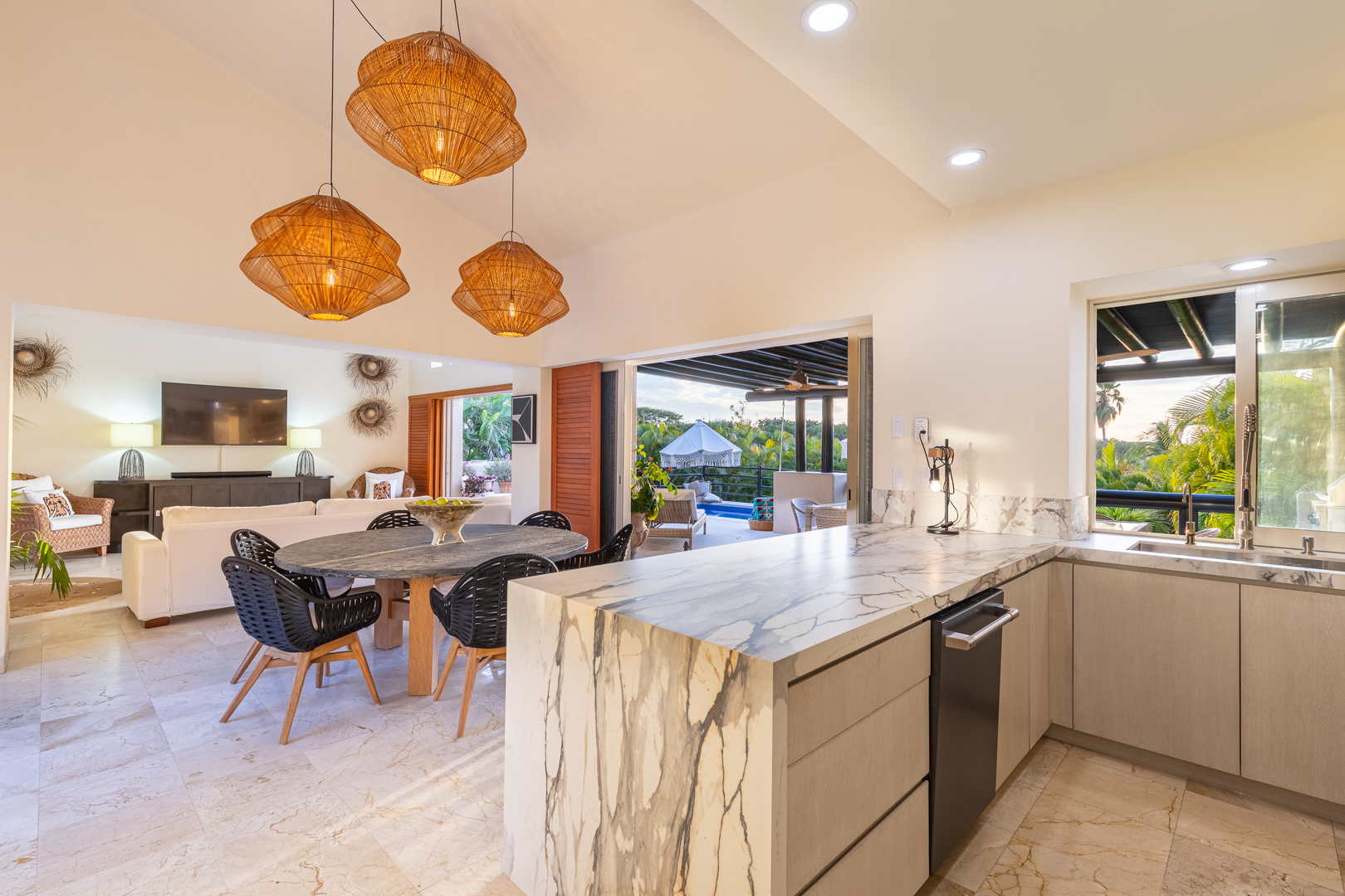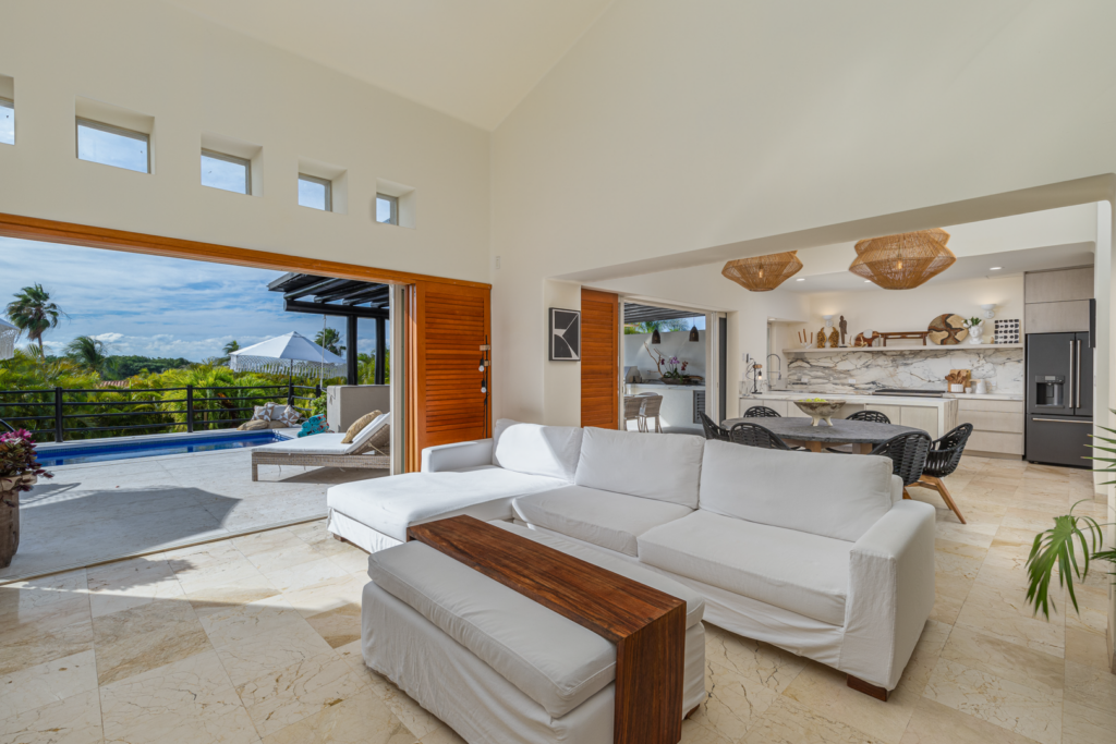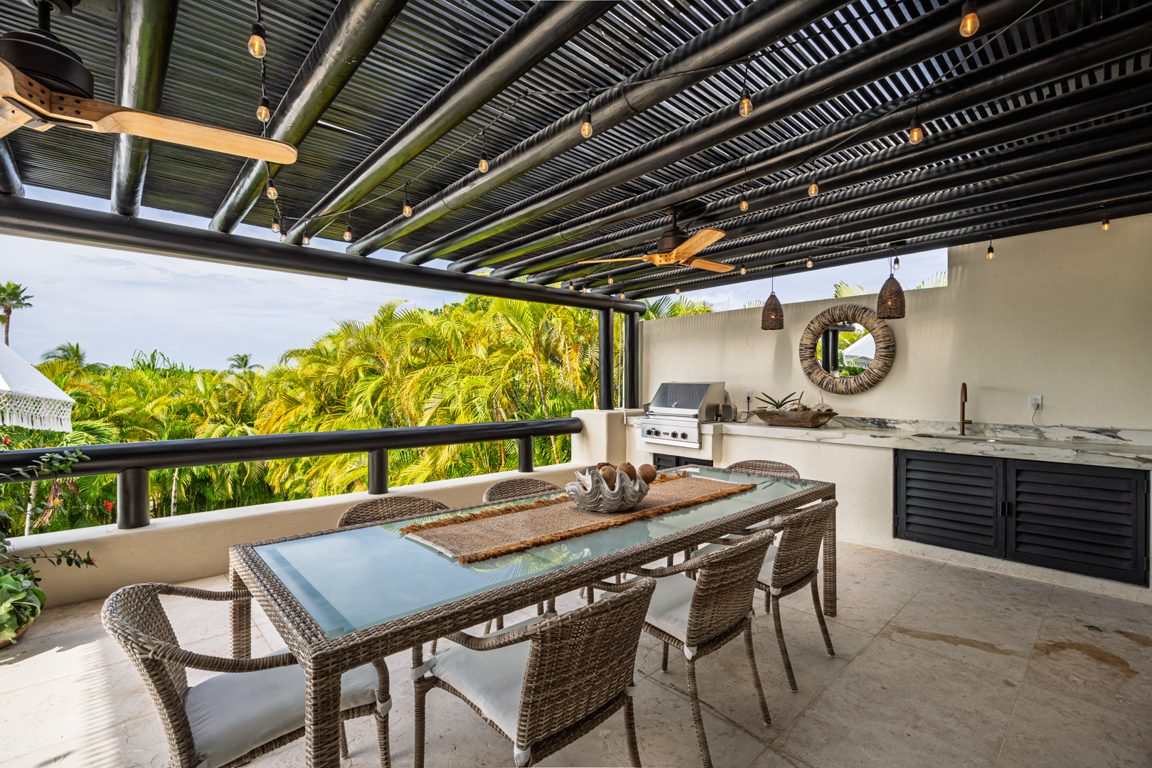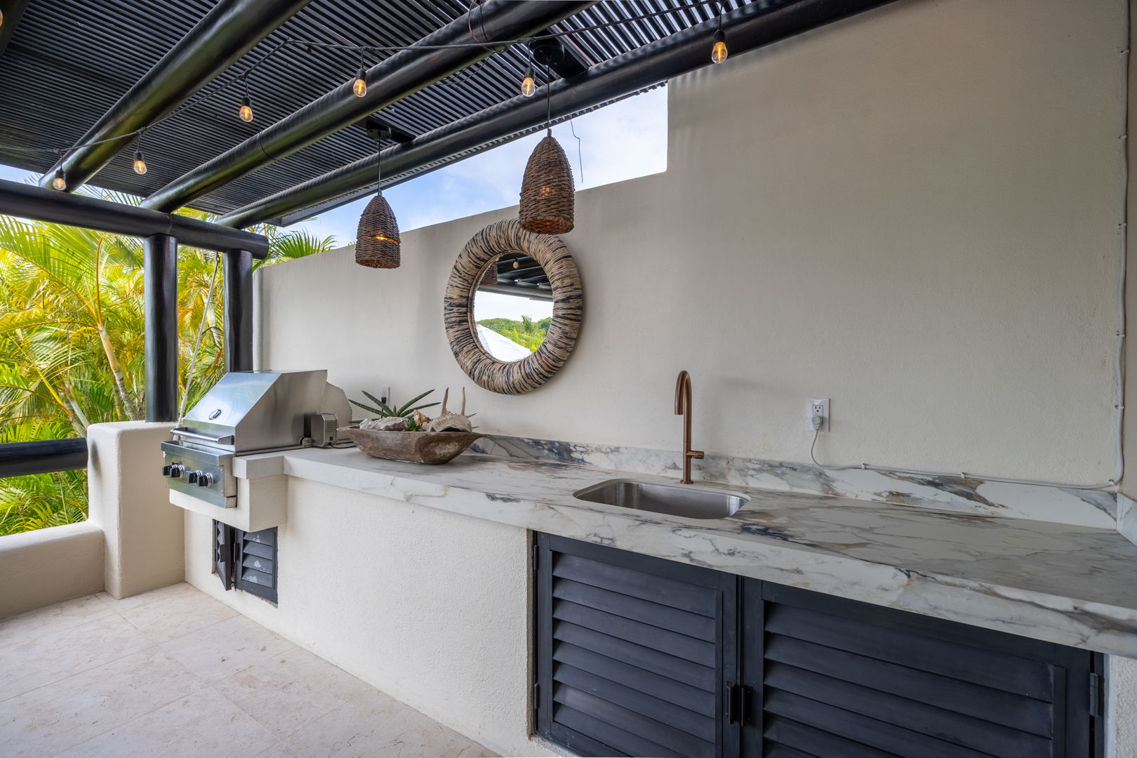 From the moment you walk through the doors of Casa Libre, you’ll be transported to paradise. The living area seems to be floating, looking out to an incredible view of blue sky, the sparkle of water from the pool, palm trees, and slivers of the ocean. The outdoor space off the living area is truly special, with covered outdoor dining for 12, perfect for family meals or entertaining. It also includes a gas grill and granite serving area with a pass-through window to the kitchen.