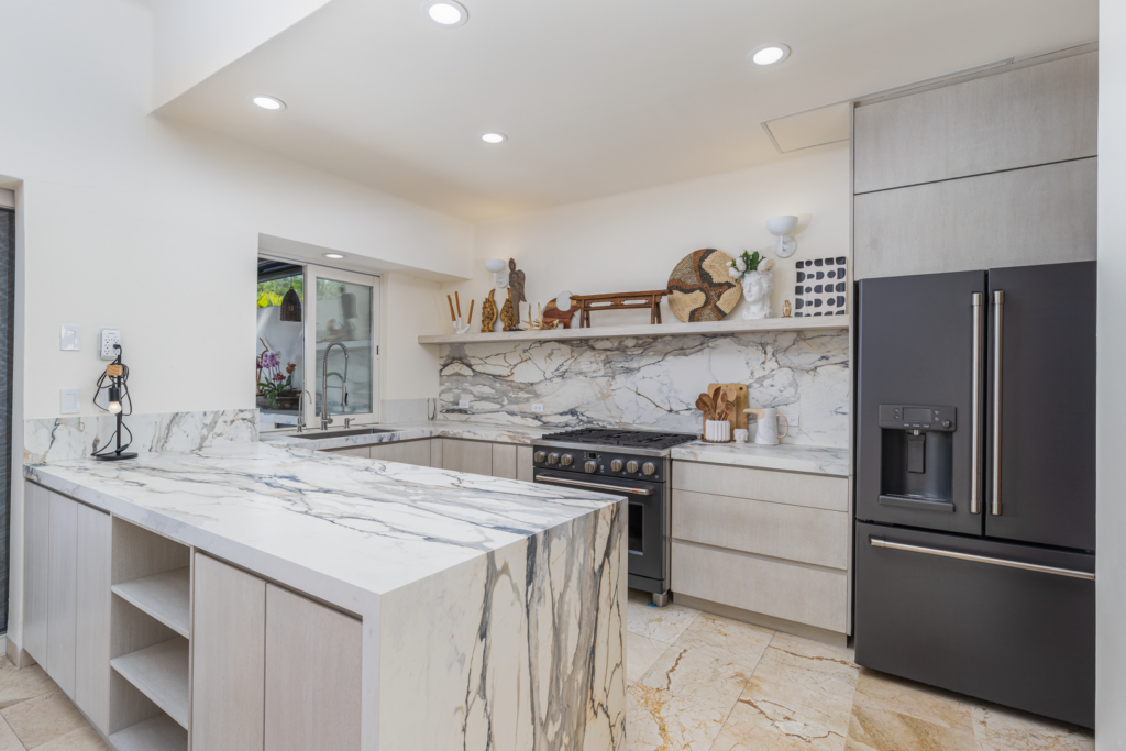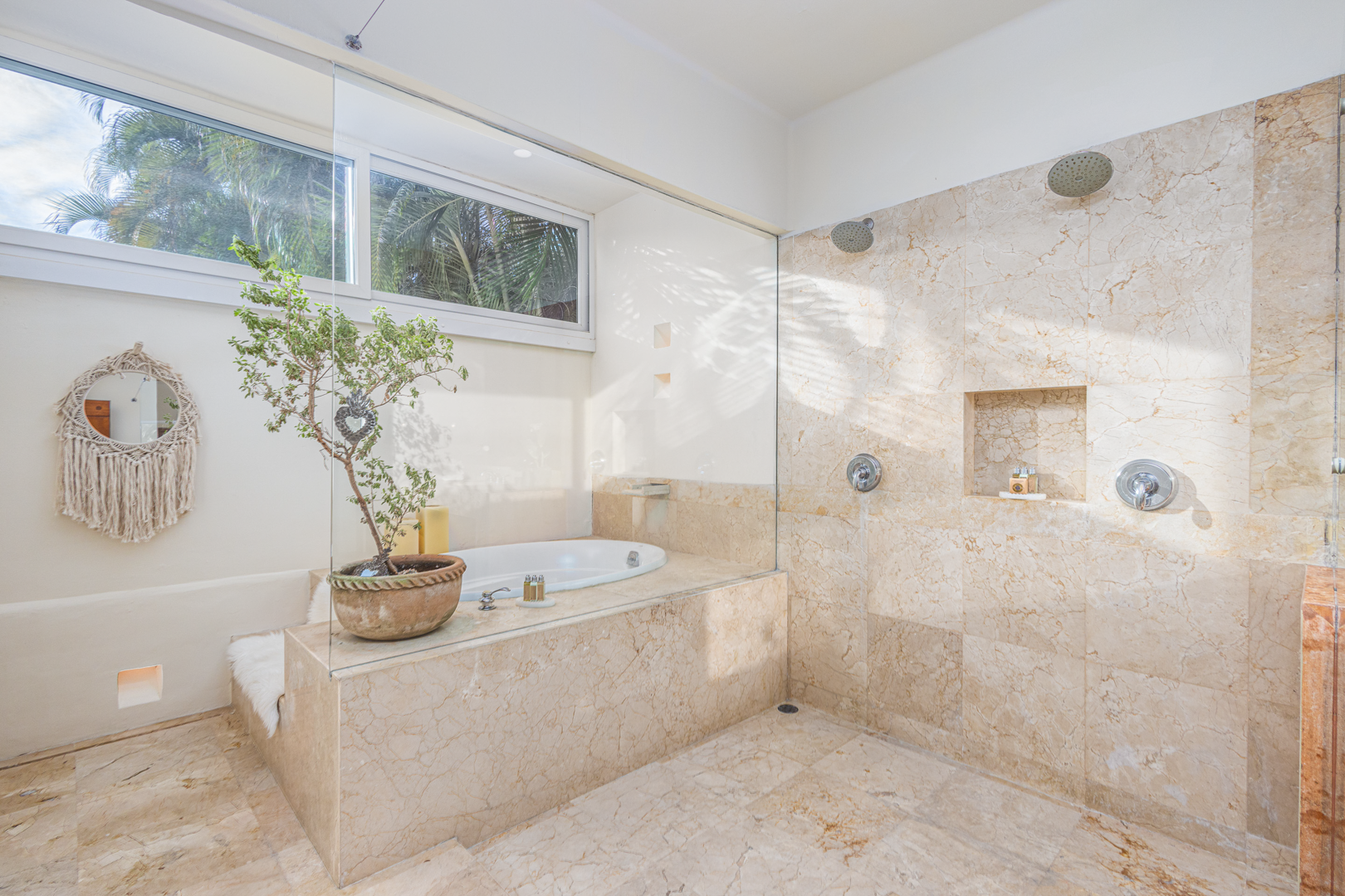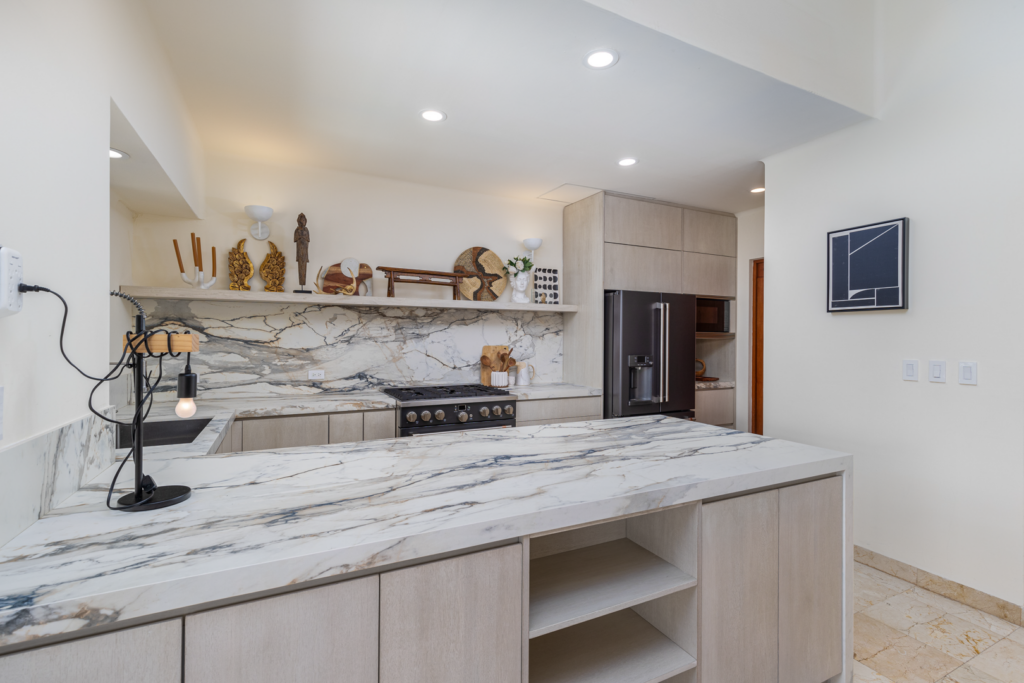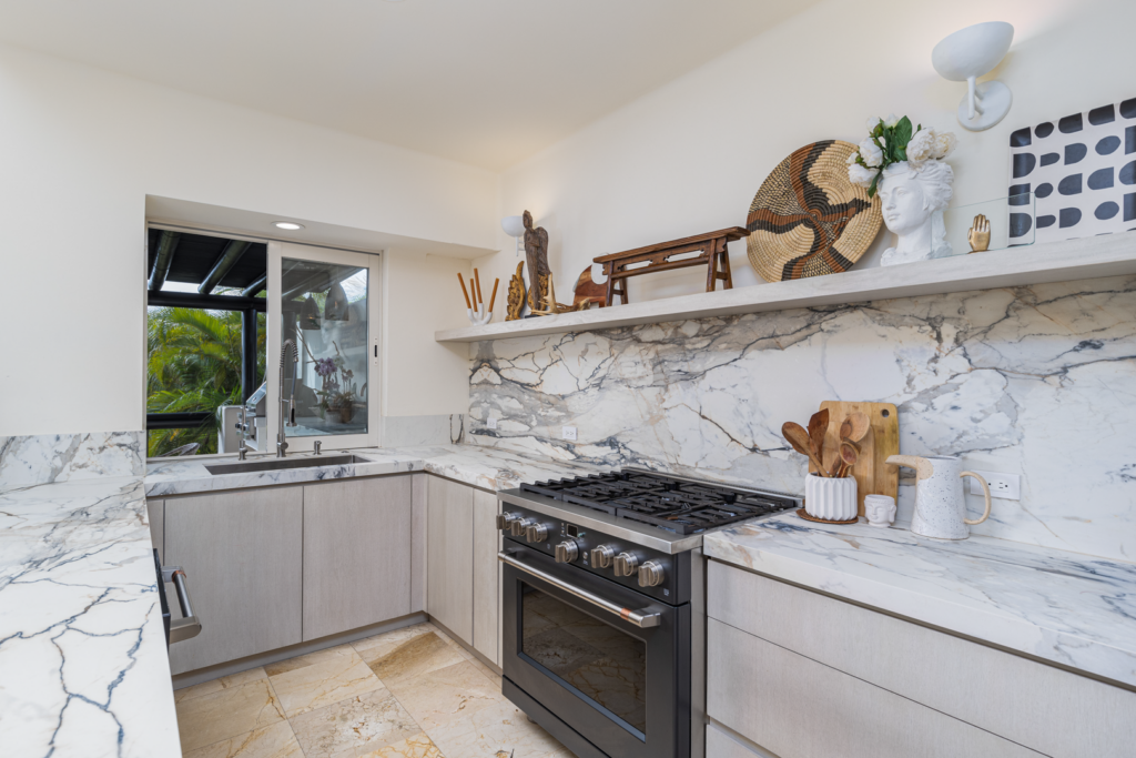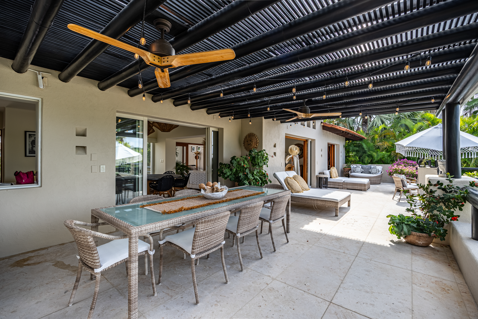 From the moment you walk through the doors of Casa Libre, you’ll be transported to paradise. The living area seems to be floating, looking out to an incredible view of blue sky, the sparkle of water from the pool, palm trees, and slivers of the ocean. The outdoor space off the living area is truly special, with covered outdoor dining for 12, perfect for family meals or entertaining. It also includes a gas grill and granite serving area with a pass-through window to the kitchen.