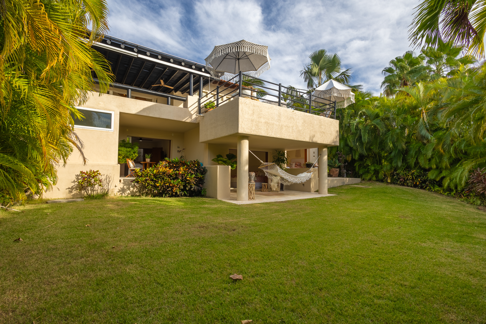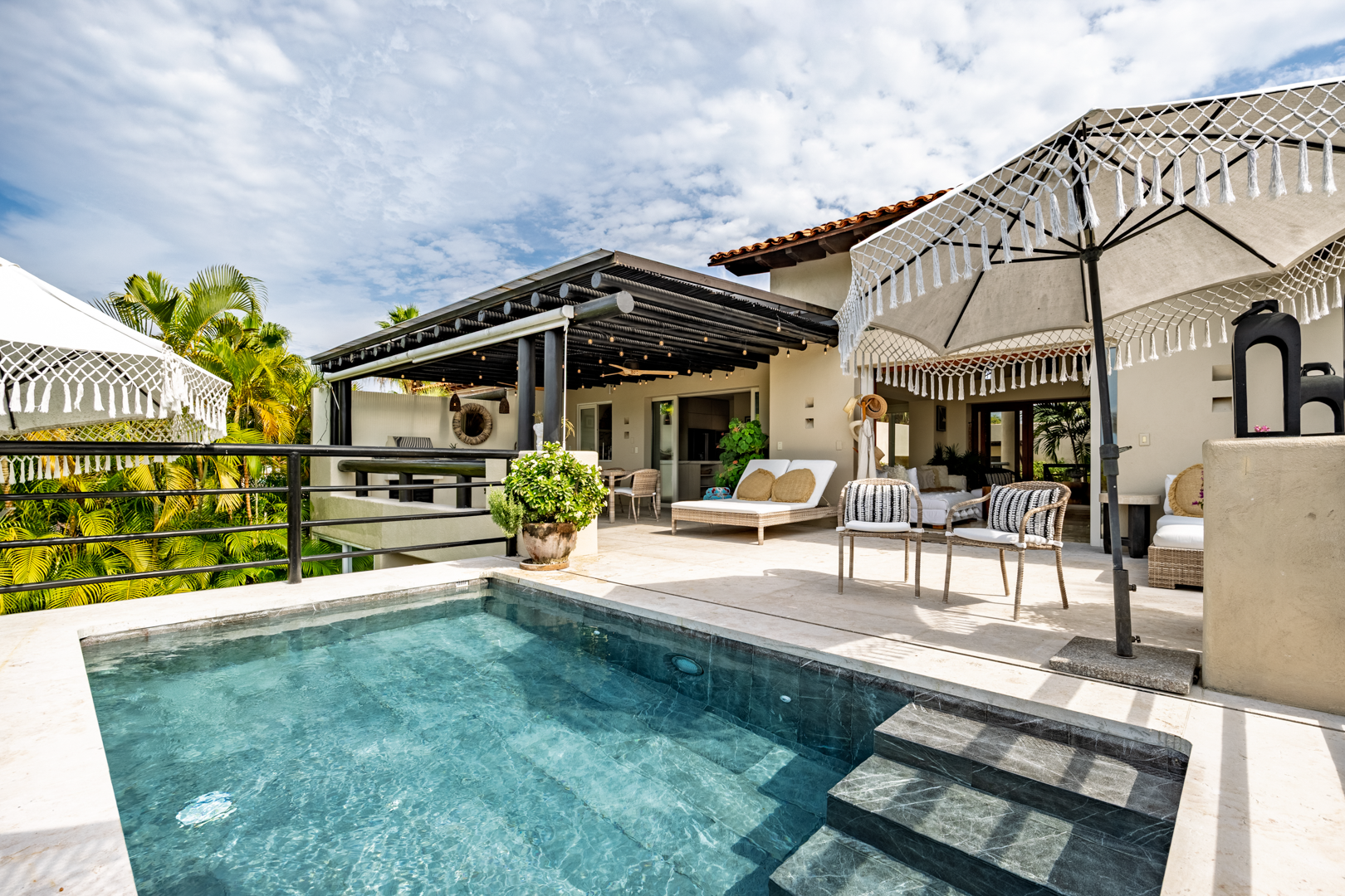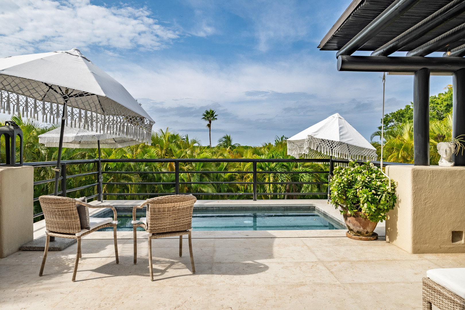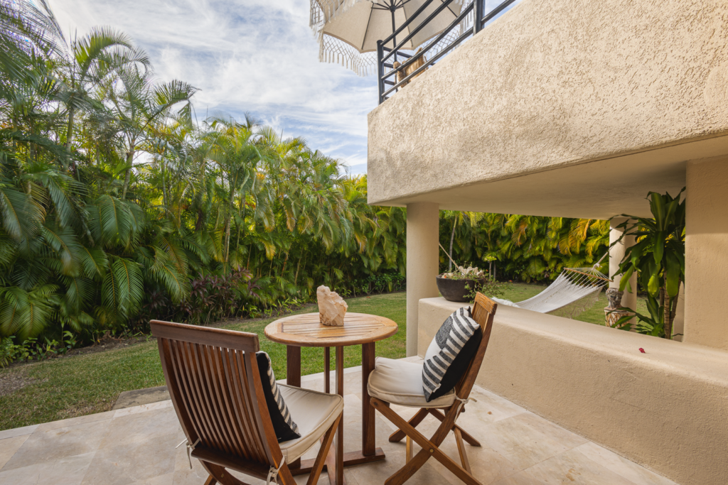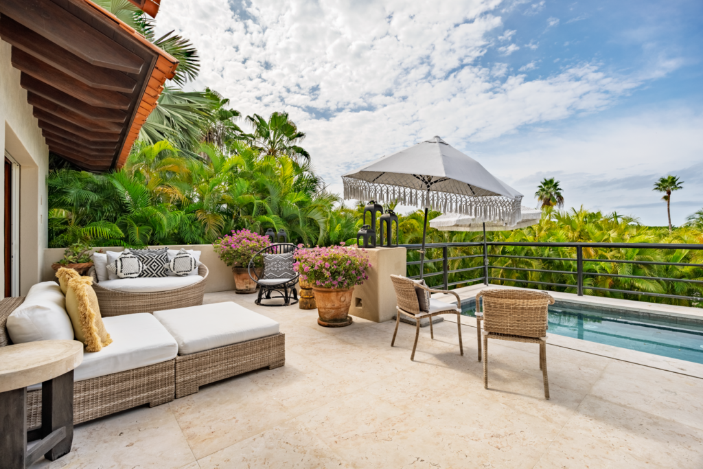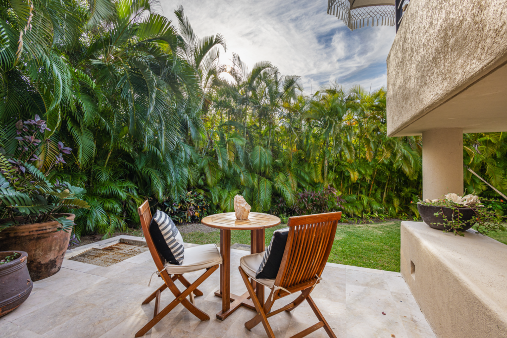 The patio area, including a plunge pool, is nestled high in the palm trees, catching the cool breezes and the sounds of the local birds and surf. It is extremely spacious with several cozy seating areas and 3 umbrellas for shade. The sunsets are truly special, as well as watching the moon rise and star gazing.