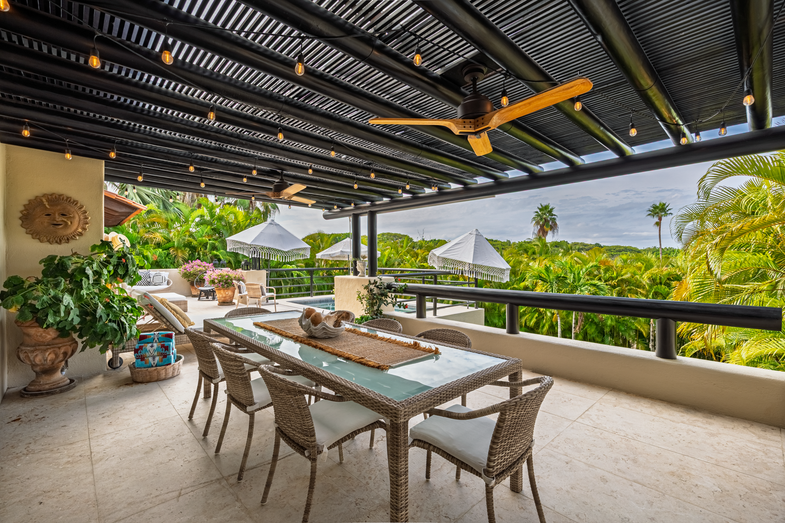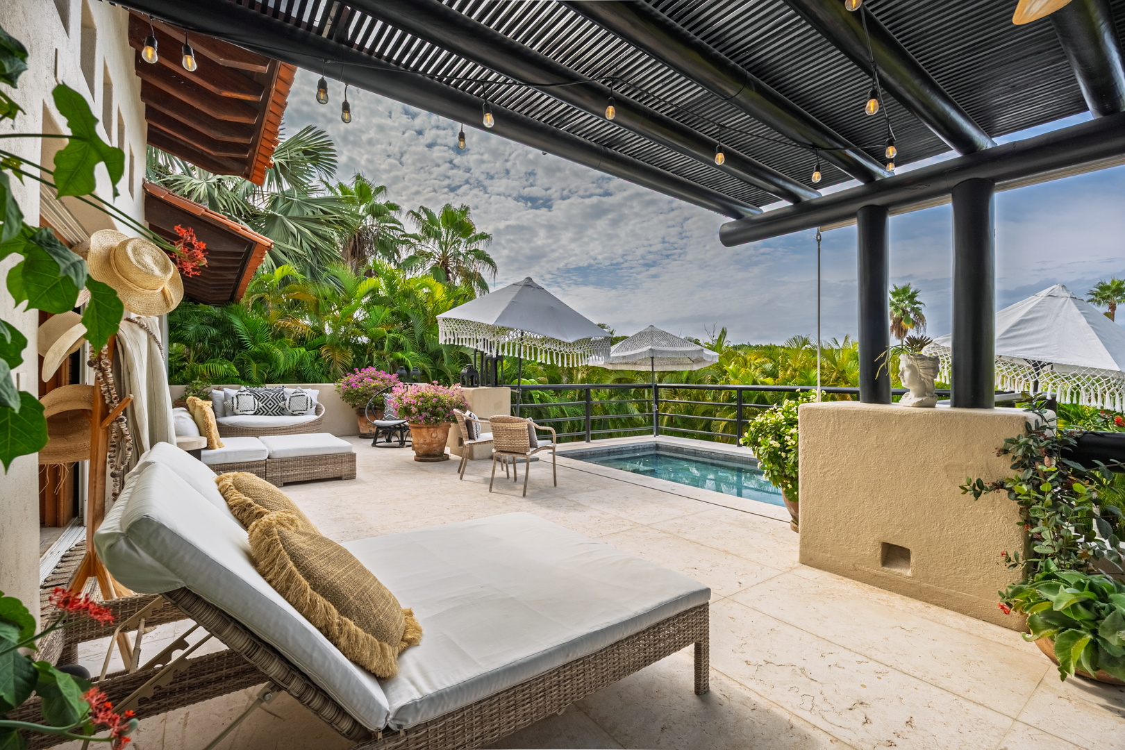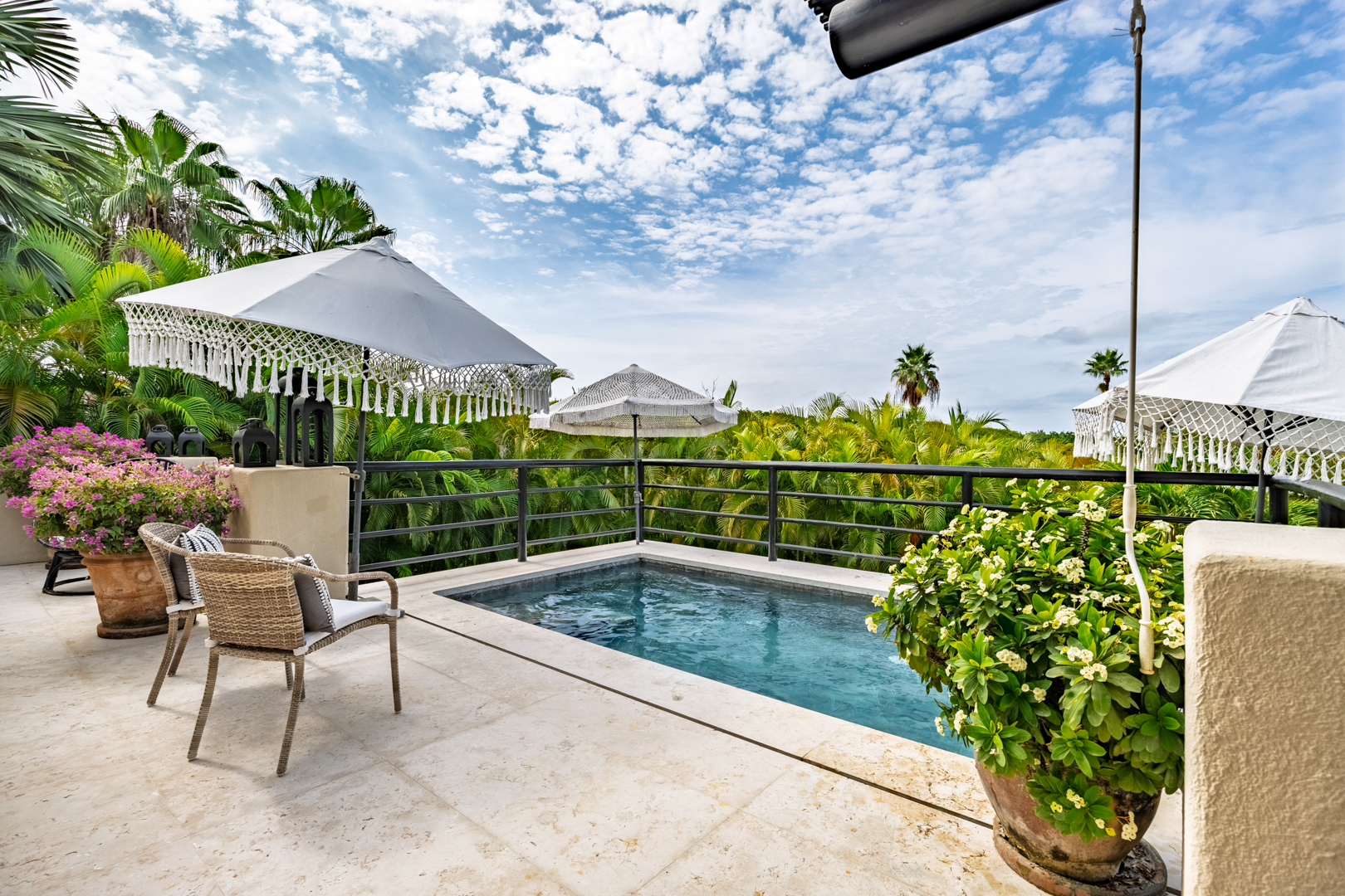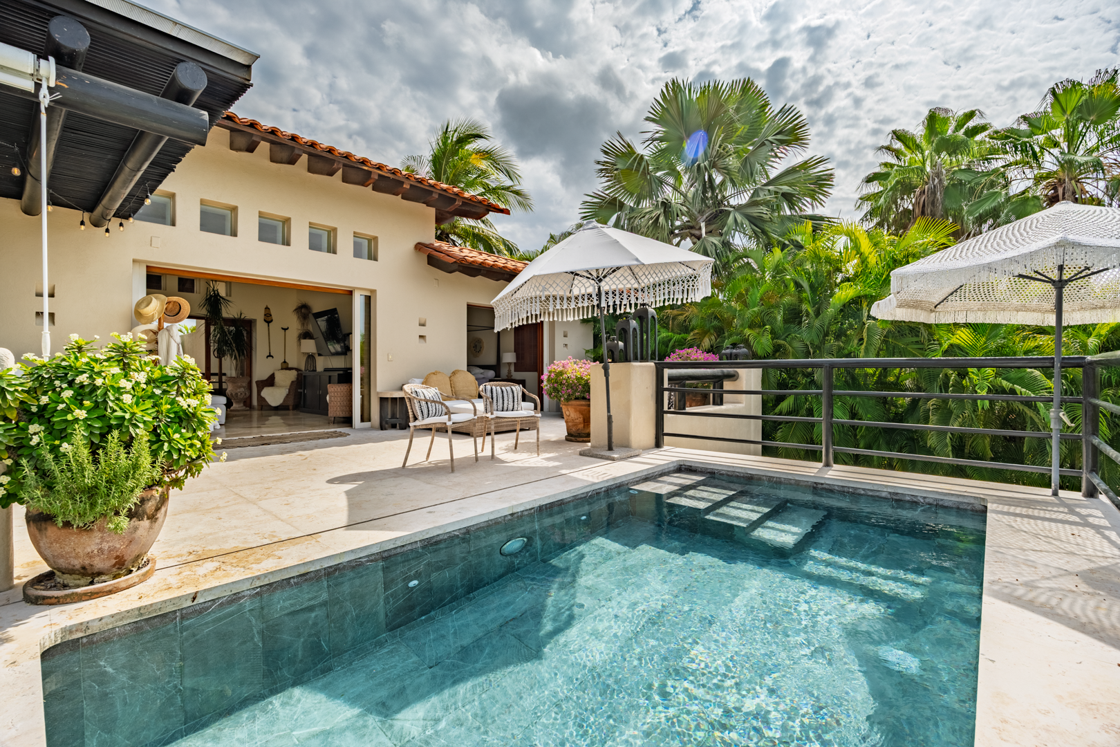 The patio area, including a plunge pool, is nestled high in the palm trees, catching the cool breezes and the sounds of the local birds and surf. It is extremely spacious with several cozy seating areas and 3 umbrellas for shade. The sunsets are truly special, as well as watching the moon rise and star gazing.