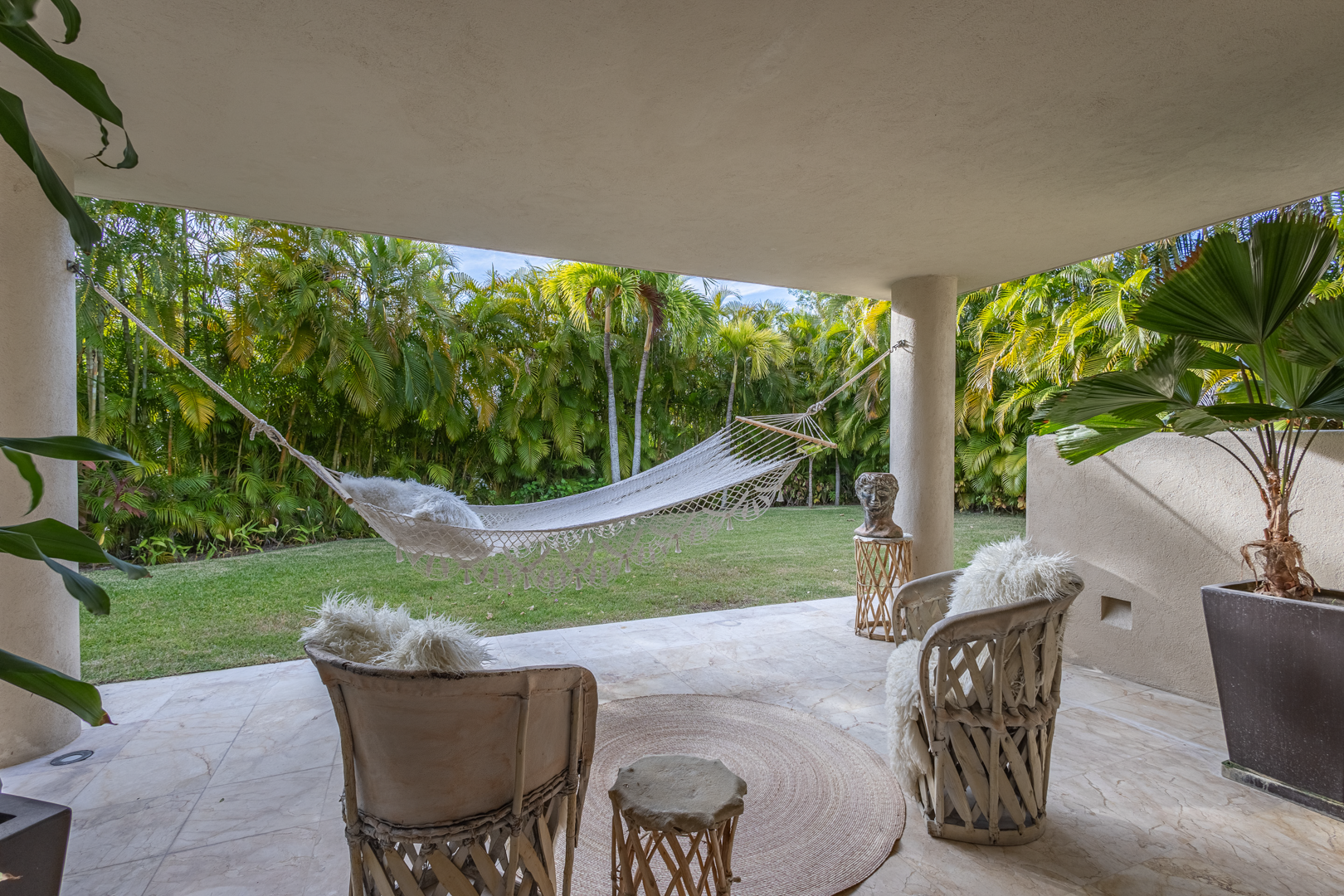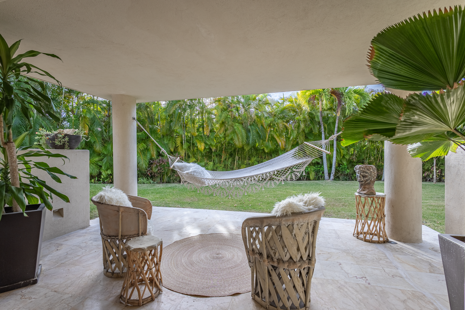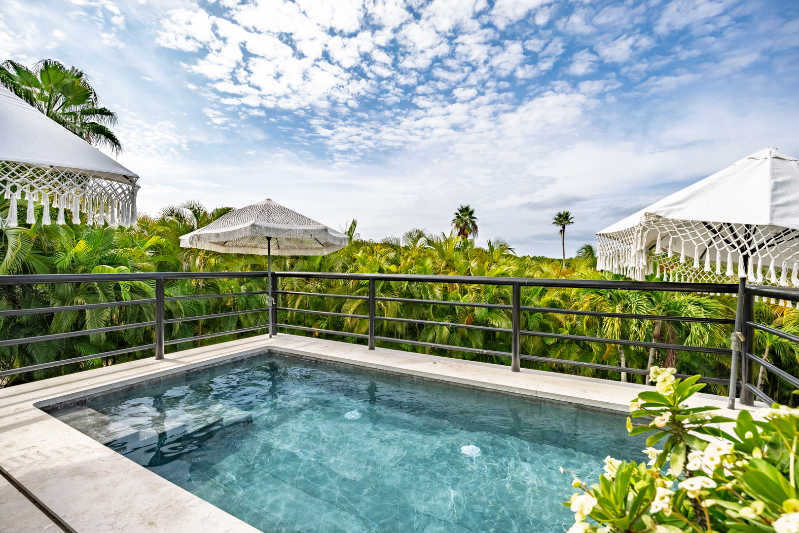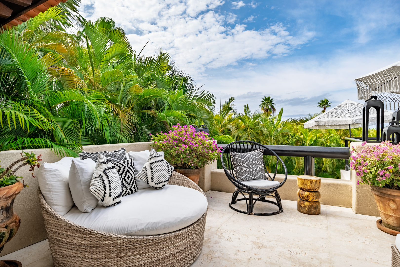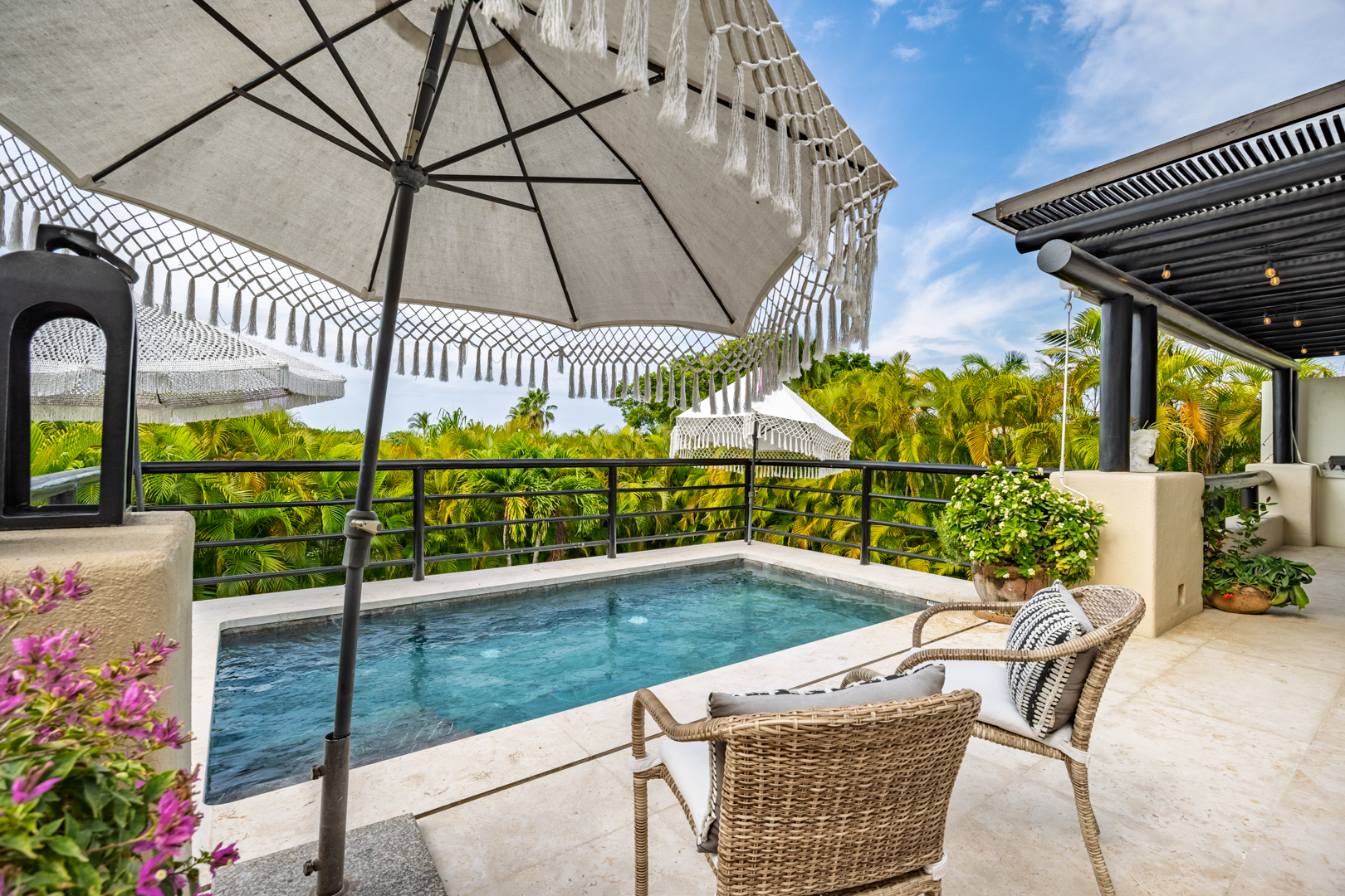 The patio area, including a plunge pool, is nestled high in the palm trees, catching the cool breezes and the sounds of the local birds and surf. It is extremely spacious with several cozy seating areas and 3 umbrellas for shade. The sunsets are truly special, as well as watching the moon rise and star gazing.