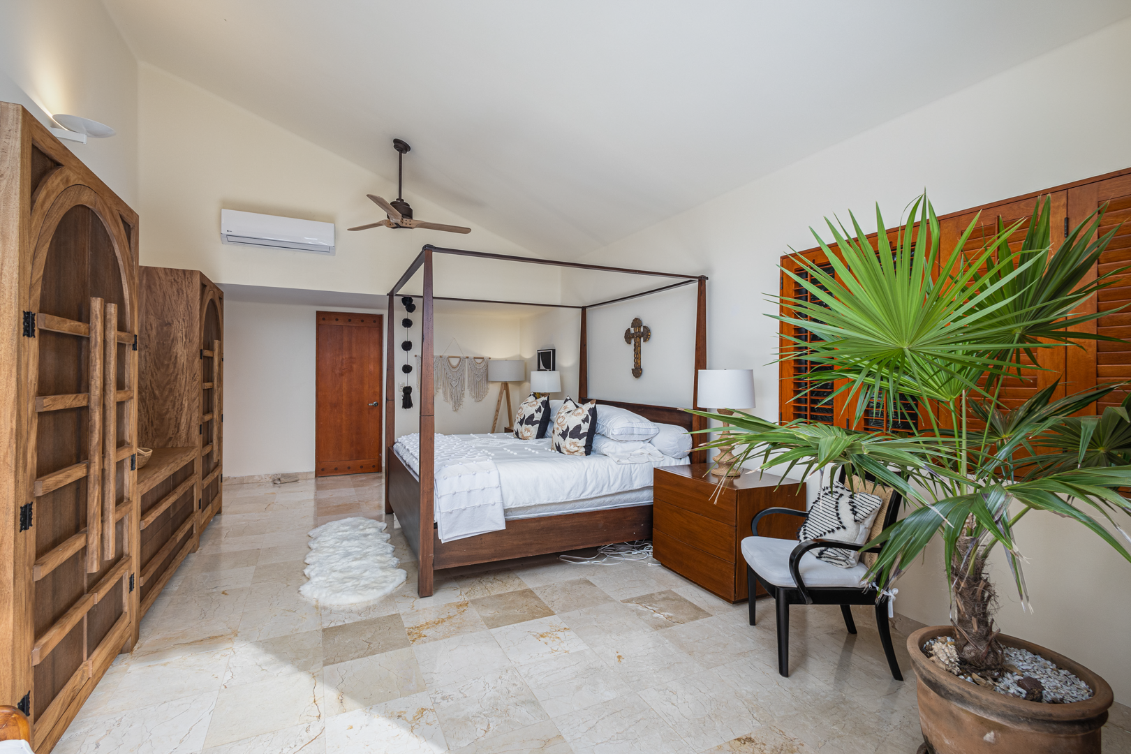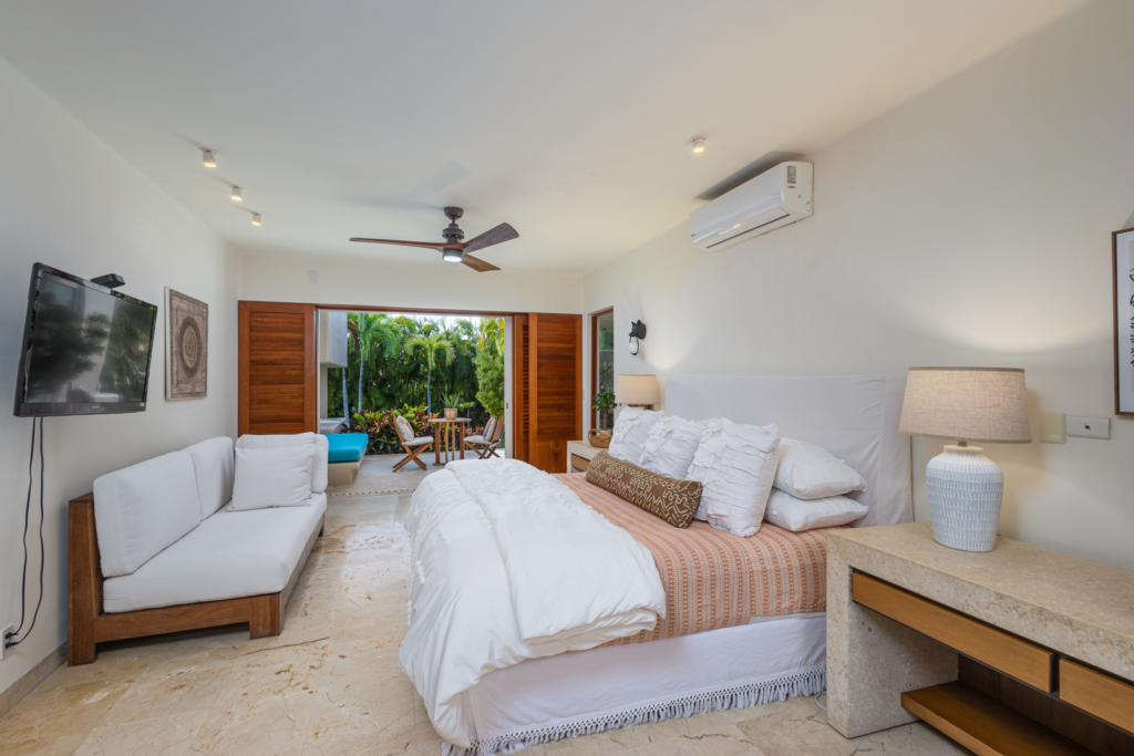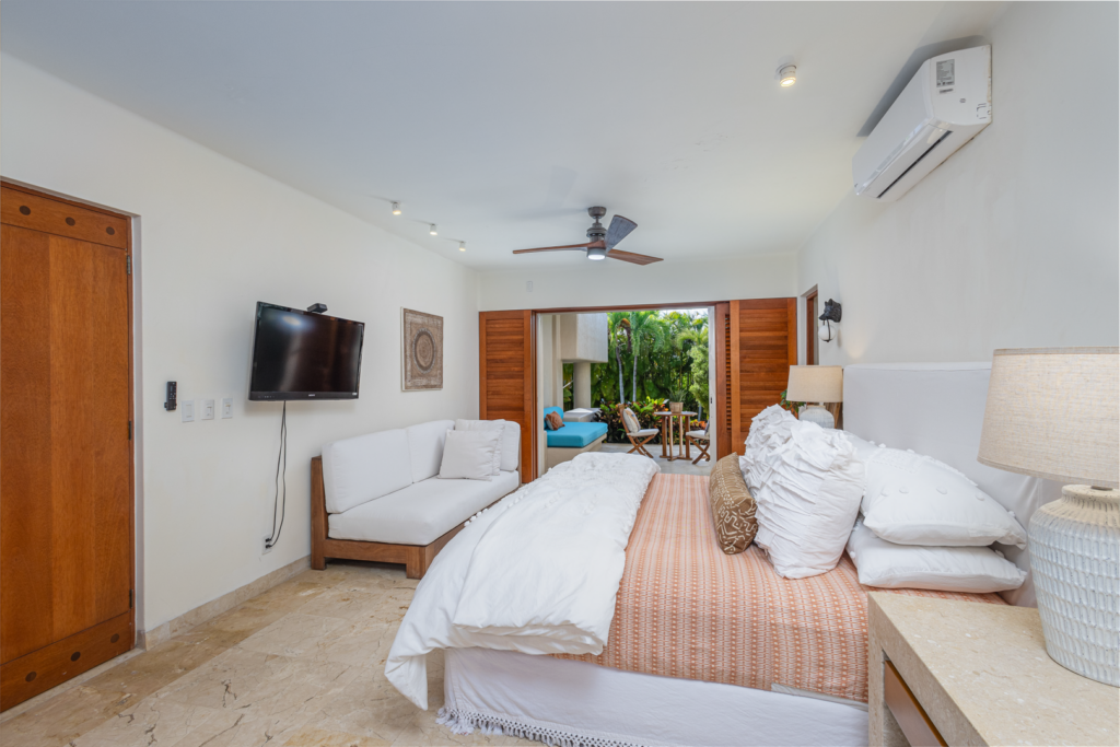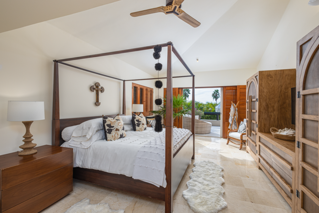Master (upper level): 1 King, TV, sofa and chairs, walk in closet, opens to pool, A/C, ceiling fan, ensuite bathroom with double vanity, inside and outside shower and bathtub.
