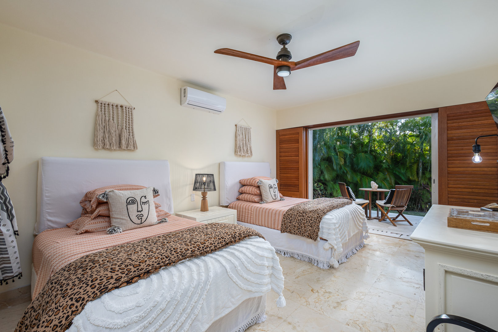 Bedroom 4 (lower level): 2 doubles, TV, balcony with outside furniture, A/C, ceiling fan, walk in closet, ensuite bathroom with vanity, inside shower and bathtub.