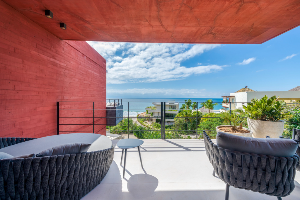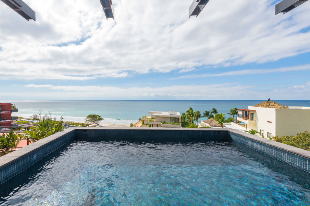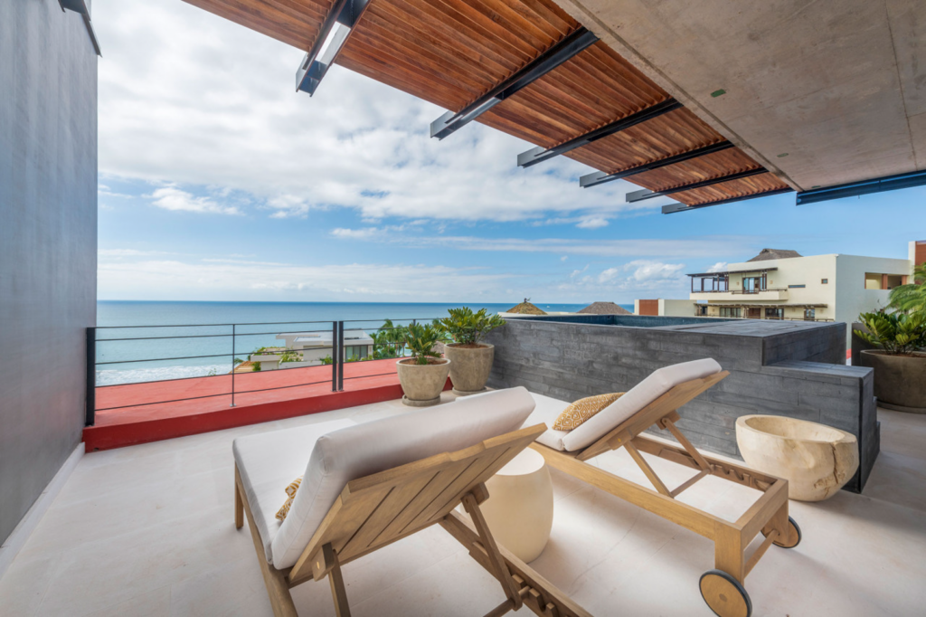 Exclusive 4 bedroom penthouse on the 4th floor of Tower 6 in Naya, Punta de Mita, just steps from the beach. Features a private pool, tropical gardens, modern interiors, and ocean views. Includes daily housekeeping. Ideal for families or groups seeking comfort and convenient access to public golf courses, beaches, restaurants, and the Puerto Vallarta Airport.