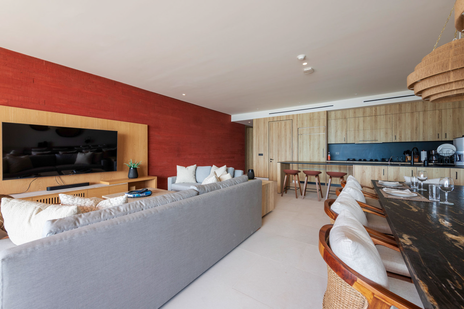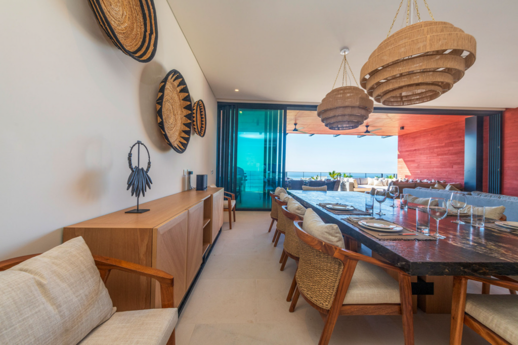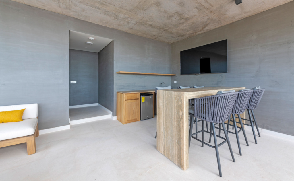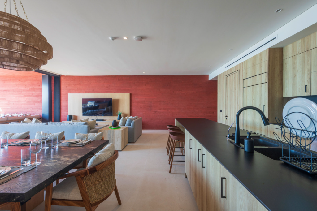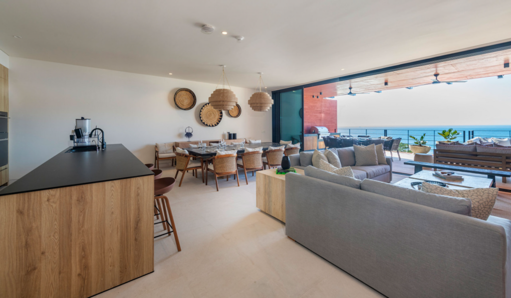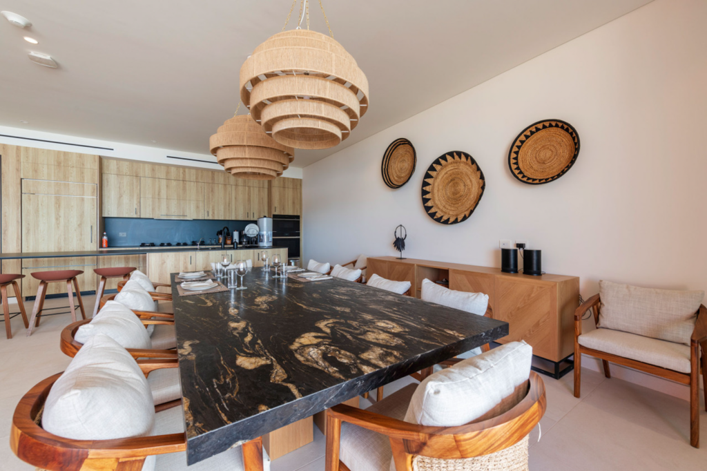 This penthouse is crafted with elegant finishes—natural stone, rich woods, and contemporary artisanal touches—to create a calm and sophisticated environment. The spacious living and dining areas are perfect for gathering, while each bedroom is designed as a tranquil haven. A modern, fully equipped kitchen allows you to cook and entertain with ease, whether you’re preparing a quick snack or hosting a private chef experience.