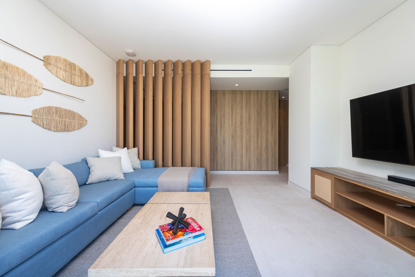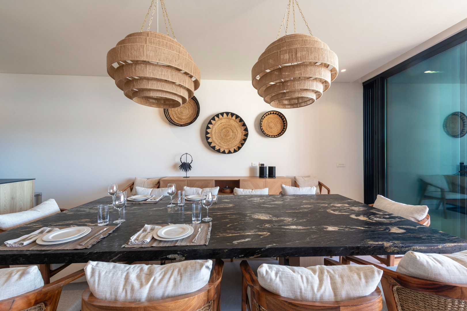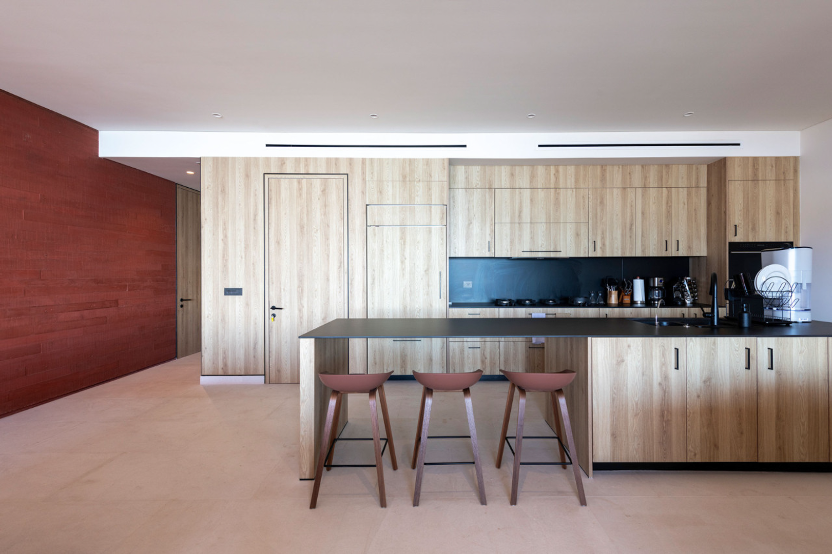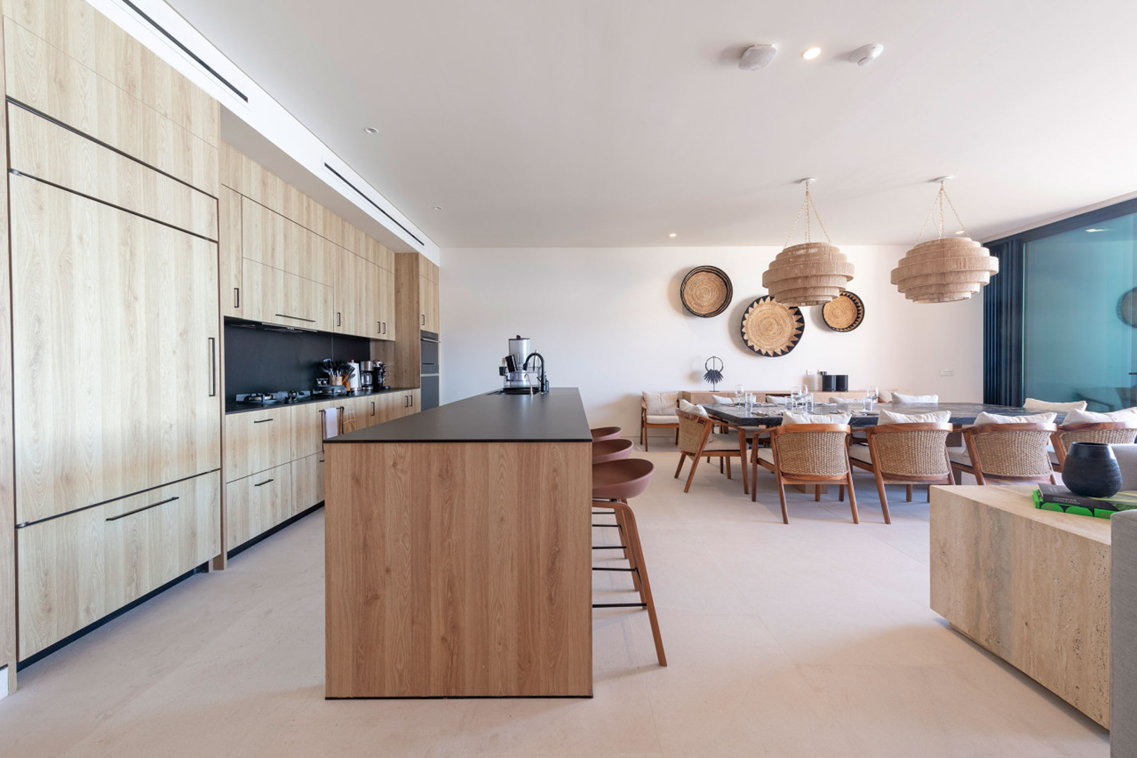 This penthouse is crafted with elegant finishes—natural stone, rich woods, and contemporary artisanal touches—to create a calm and sophisticated environment. The spacious living and dining areas are perfect for gathering, while each bedroom is designed as a tranquil haven. A modern, fully equipped kitchen allows you to cook and entertain with ease, whether you’re preparing a quick snack or hosting a private chef experience.