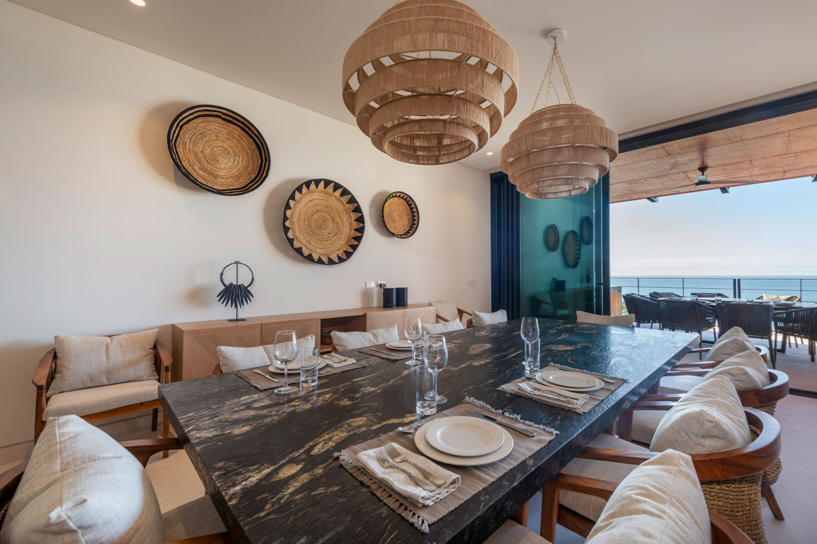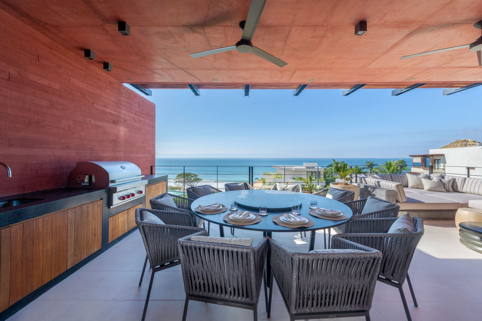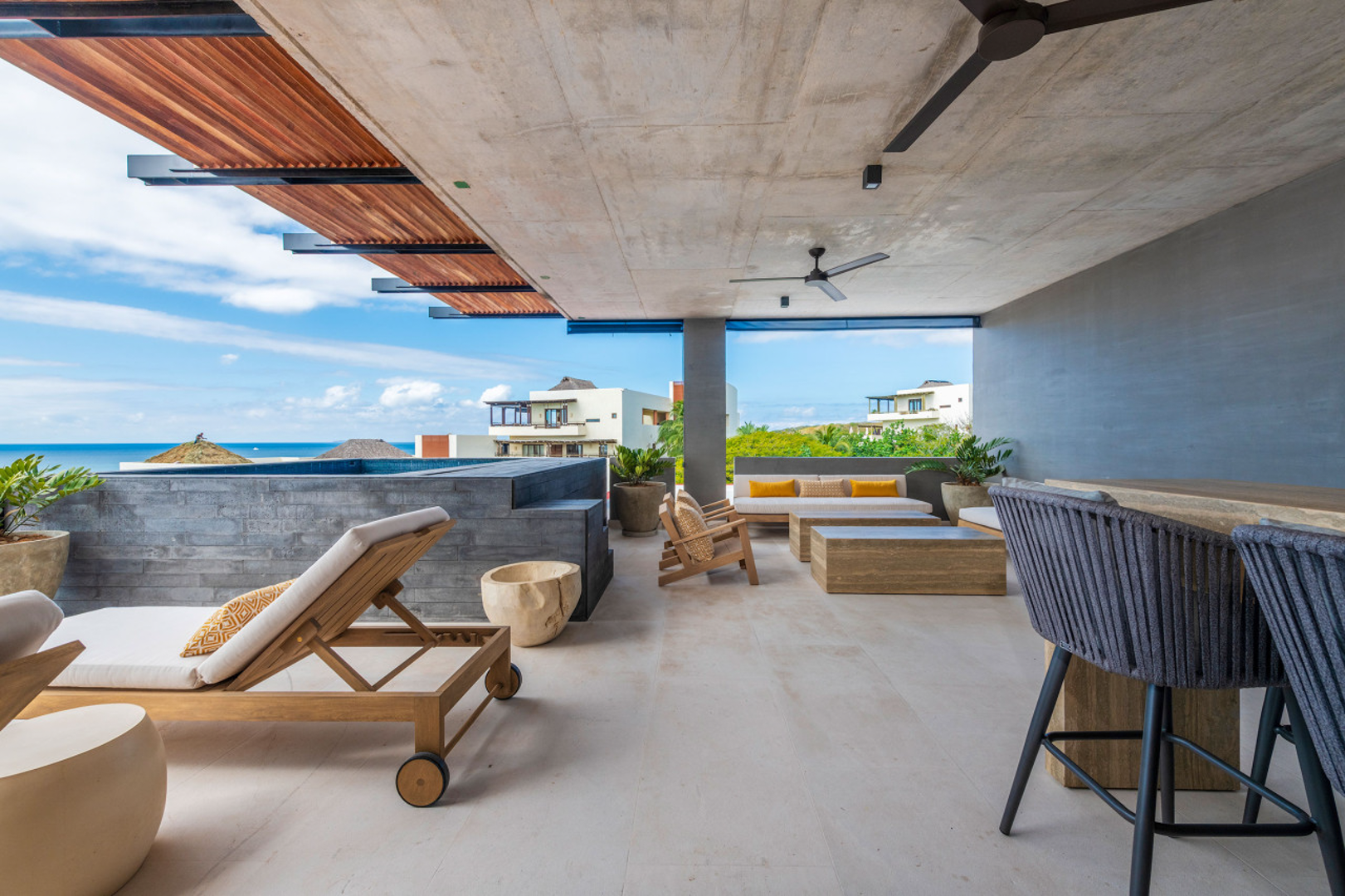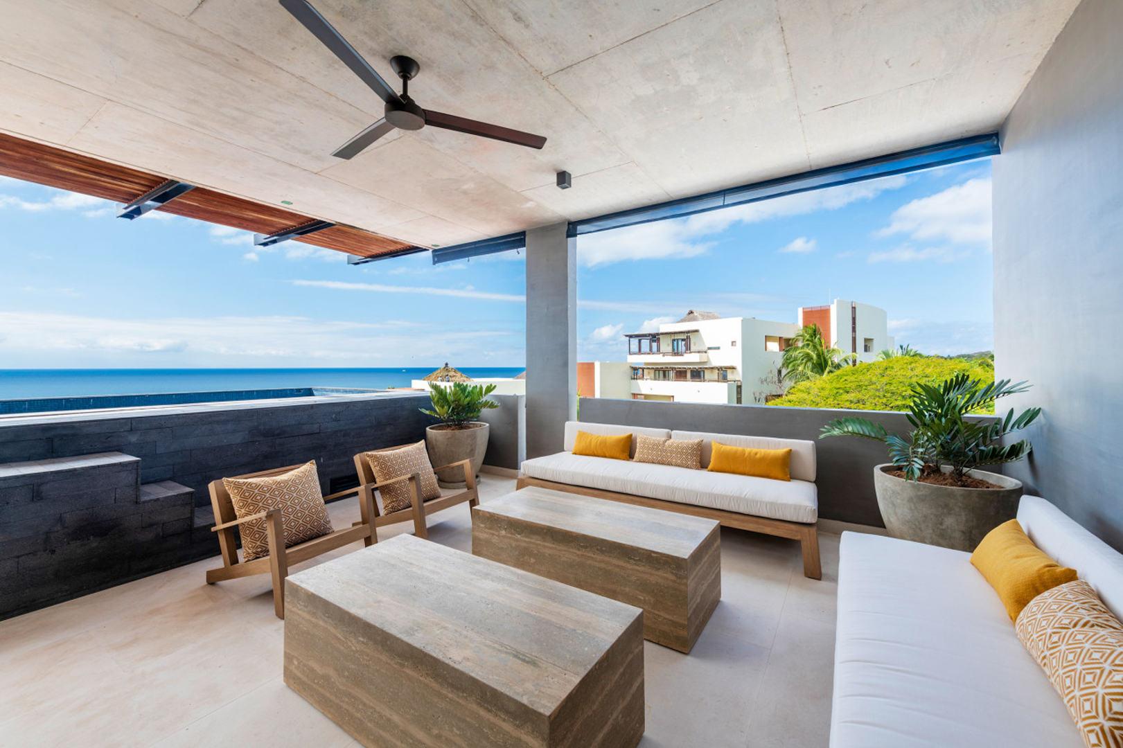 Step inside and feel instantly connected to the coastline. Sunlight pours through expansive windows, leading you toward sweeping views of the sea, tropical canopy, and glowing evening sunsets. Multiple terraces extend the living space outdoors, offering an inviting backdrop for open-air dining, morning coffee with ocean breezes, or peaceful downtime surrounded by nature.