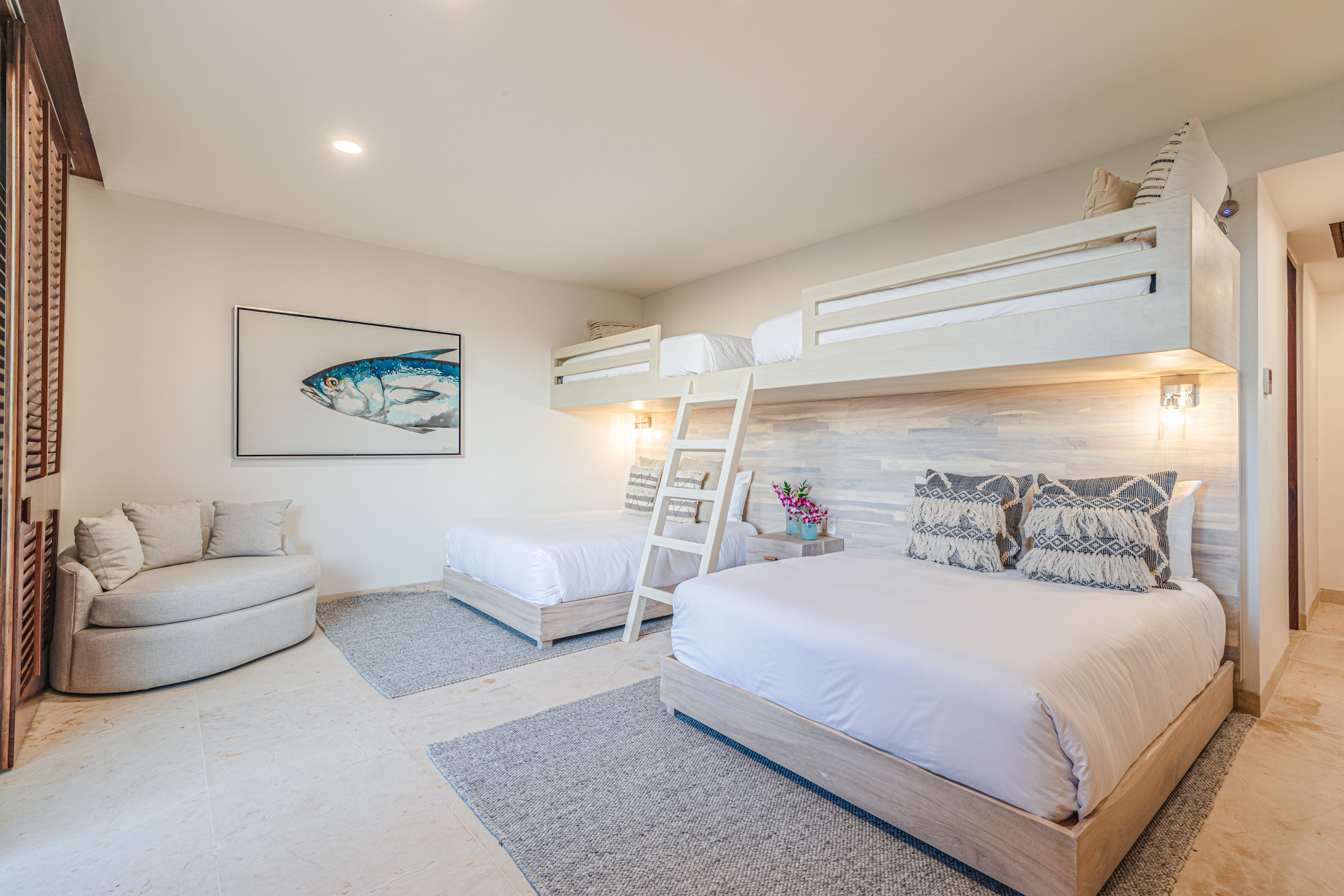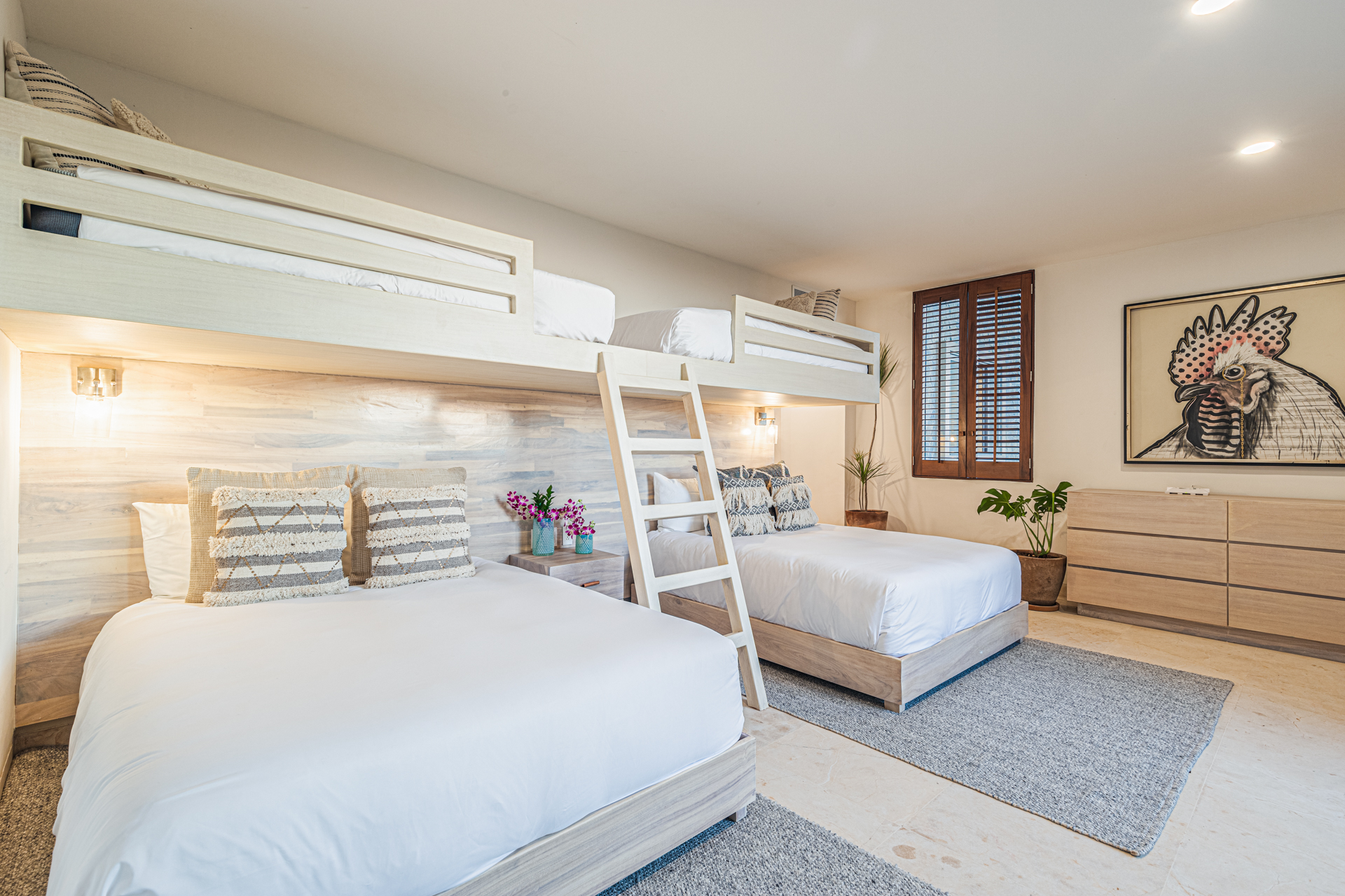 Bedroom 3 = 2 Queens each with single bunk above perfect for kids, AC, balcony, outside furniture, distant ocean views, ensuite bathroom with closet, dual vanity, shower and bathtub